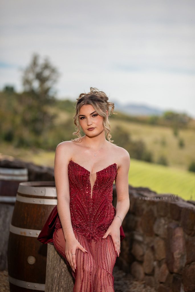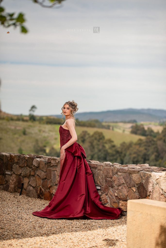 Ek het van die heel begin af geweet my Matriekafskeid rok moet Wyn rooi wees. Wyn rooi verteenwoordig Elegansie, Kragtigheid, Luuksheid en dit is persies hoe ek wou gevoel het op my spesiale dag. Die groot Struk en lang Sleep dui op my Persoonlikheid : Vroulik en Dramaties. Al die detail was hand vas gewerk om die rok uniek te maak, soos wat ek is. Die Sleep kan af gehaal word, sodat ek maklik my aand saam my vriende kan geniet en dans.
