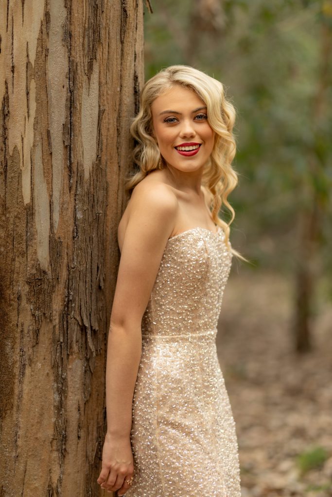 Ek het op n elegante champanje kleur rok besluit aangesien dit my nog altyd aan koninklikes laat dink het. Daar word baie vir my gesê dat ek ń mooi figuur het wat ek moet wys en dus het ek besluit dat my rok styf moet sit om my liggaamsvorm te komplimenteer. Ek wou genoeg beweeglikheid hê sodat ek lekker kon dans en myself geniet so dus het my rok effens uitgevloei aan die onderkant. Ek het ń toe rug gehad sodat die bandlose rok kon bo bly en ek nie ongemaklik was nie. Daar was n slit op my regterbeen wat definitief dans en loop vergemaklik het.