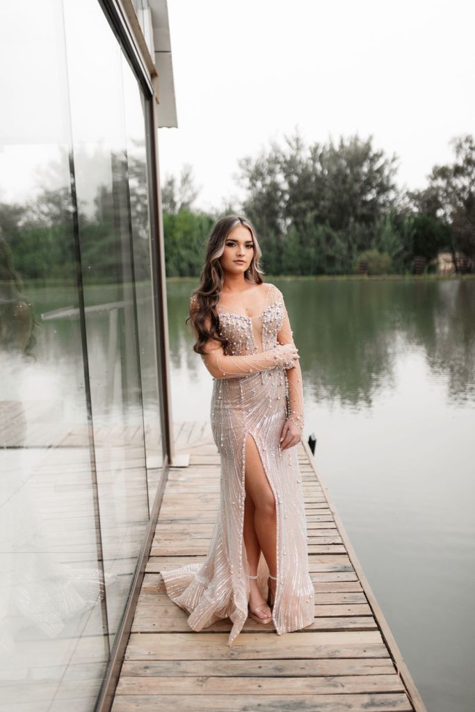 My inspirasie was om ’n glamorous maar classy voorkoms te skep – iets tydloos en elegant. ‘n Kleur met sagte perels, glitter en kant-detail bring ’n gevoel van luuksheid en vroulikheid, sonder om te oorweldig. Dit weerspieël presies hoe ek op dié spesiale aand wou voel – stylvol, selfversekerd en uniek.
