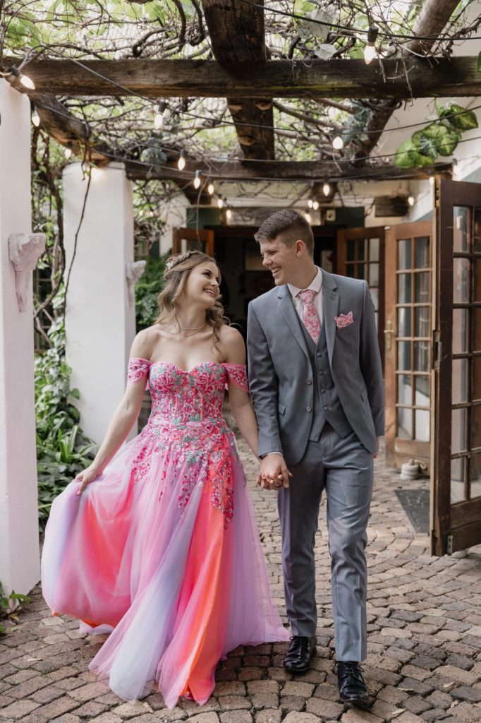 Ek het nog altyd daarvan gedroom om ’n unieke, helder pienk rok te dra. In die begin van die jaar toe sien ek presies hierdie rok van ’n oorsese designer op Instagram. Ek het dadelik verlief geraak op die styl, die kleurpalet en die fyn blommetjiesborduurwerk van die rok — ek kon myself onmiddellik daarin sien. Die helder kleure en die elegante blomdetail het dadelik my aandag getrek en het presies die vrolike, sprokiesagtige gevoel gegee waarna ek gesoek het. Ons het toe die presiese rok, al die pad van Los Angeles in Amerika invoer met behulp van familie en vriende.