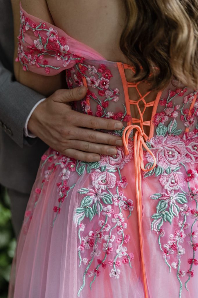 My gunsteling deel van die rok was hoe al die helder kleure, pink en silver diamantjies so pragtig saamgesmelt het en ’n sprokieswêreld rondom my geskep het! Ek kon nie genoeg kry van die fyn blommetjiesborduurwerk op die bolyf nie — dit het gevoel asof elke blomnetjie net vir my gemaak is. Dit het die rok nie net elegant en romanties gemaak nie, maar het ook ’n persoonlike en onvergeetlike aanraking gegee wat die ontwerp regtig uniek gemaak het.