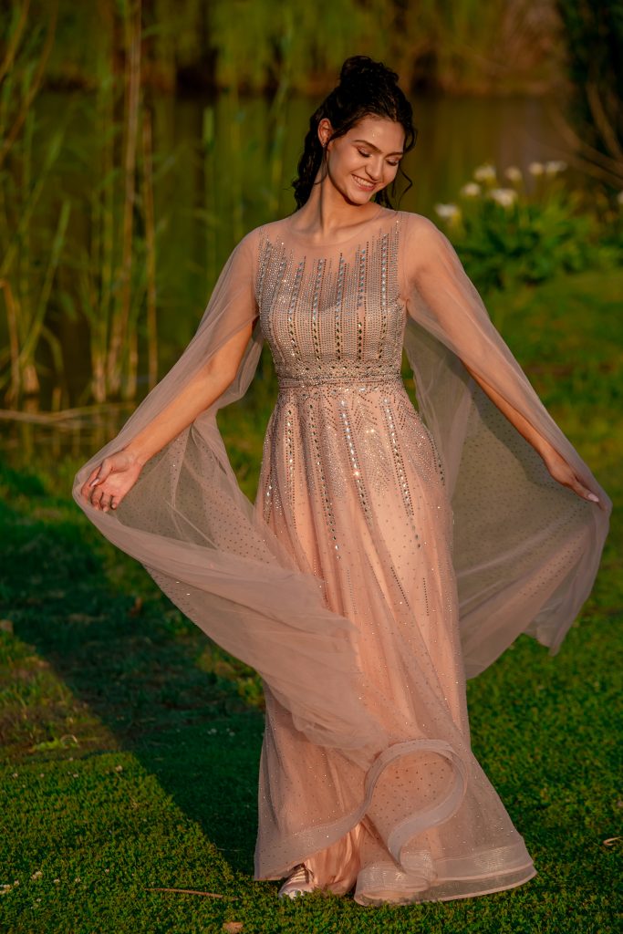 Die inspirasie vir my rok was vroulikheid, weelderige romanse & tydlose elegansie. Iets wat lig, vloeiend en dromerig voel. Ek wou ‘n rok hê wat stylvol maar uniek is. ‘n Ontwerp wat my persoonlikheid weerspieël: vroulik, selfversekerd en klassiek, met ‘n tikkie glans. Ek het gekies vir sagte lyne en luukse detail wat die gevoel van ‘n sprokie vasvang. Die ligpienk kleur simboliseer sagtheid en grasie. Die silwer steentjies verteenwoordig lig, vonkies van hoop en droomliggies wat my pad verlig. Ek wou iets dra wat stylvol is, en wat innerlike waardigheid en stil skoonheid uitstraal.