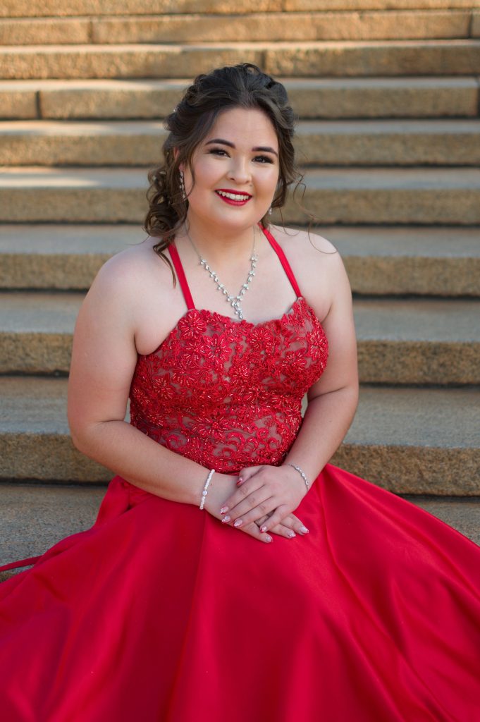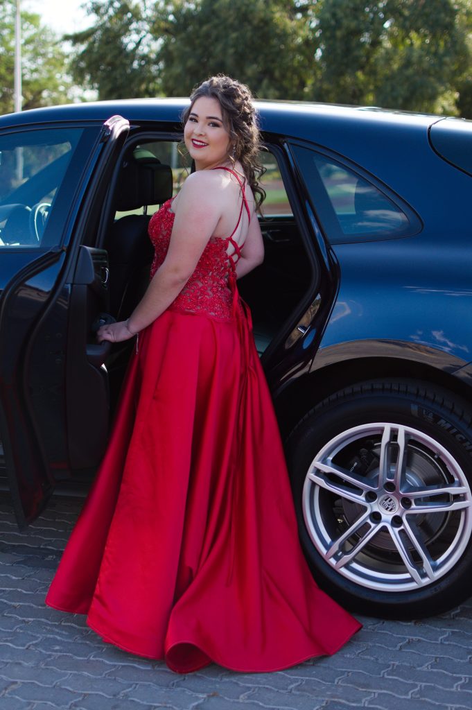 Ek het eendag op Pinterest vir inspirasie gesoek van verskillende style rokke. Ek het op ʼn foto afgekom wat ek van gehou het. Ons het besluit om ʼn paar rokke te gaan aanpas om te sien hoe dit op my sal lyk. My oorspronklike idee was om ʼn blou rok te hê maar nadat ek ʼn rooi rok aangepas het, het ek verlief geraak op hoe die kleur op my lyk. Die eerste ding wat ek vir my gesê het, is dat ek ʼn oop rug soek met die kombinasie van ʼn korset. Vir die romp gedeelte het ons ʼn vol sirkel gebruik waarvan die agterkant langer is wat vir my daai prinses gevoel gegee het. My gunsteling deel van die rok is dus die bolyf. My ma het met die hand die rooi kant aangewerk op ʼn vlees kleur materiaal.