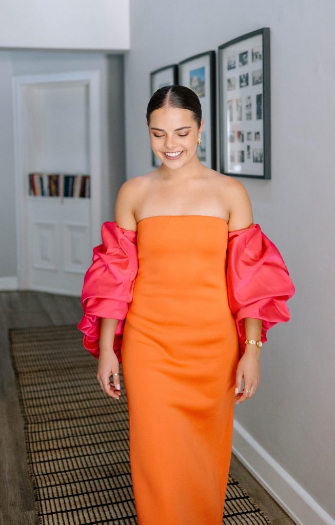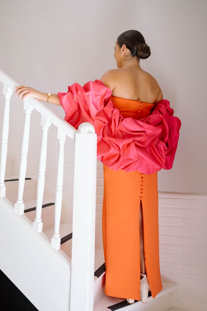 Ek het geweet my matriekafskeid rok praat, kleur! Ek wou kleure bymekaar sit wat my die beste komplementeer , my veltoon laat straal en my energie laat sprankel. Die lewendige oranje simboliseer warmte en lewenslus, terwyl die dramatiese, gestruktureerde pienk volume om my skouers vou. Dit is waar my styl en my persoonlikheid mekaar ontmoet het.