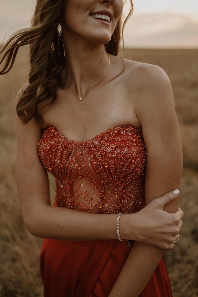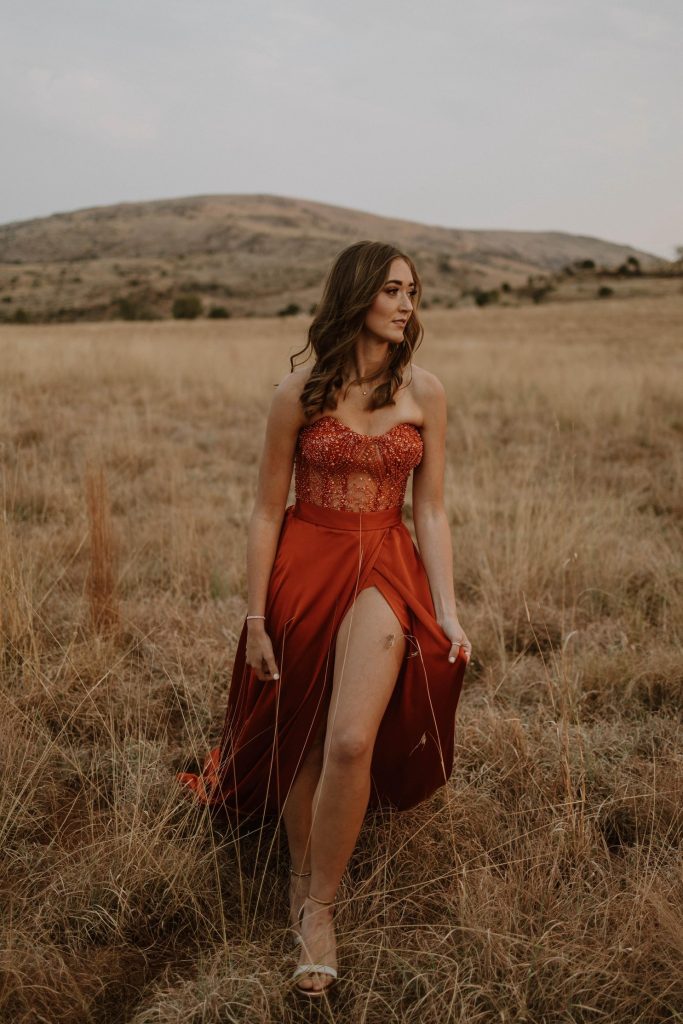 My rok is ontwerp deur Isham Hamilton. Ek het doelbewus die kleur gekies – ’n ryk burnt orange satyn – omdat dit pragtig by my blas veltoon pas. Die ontwerper het fyn klein blommetjies in dieselfde skakering gemaak, elkeen versier met kraletjies en besonderse aandag aan detail. Om die geheel te voltooi, is daar ’n elegante lint om my middellyf geplaas, presies waar die korset en die lap bymekaarkom.