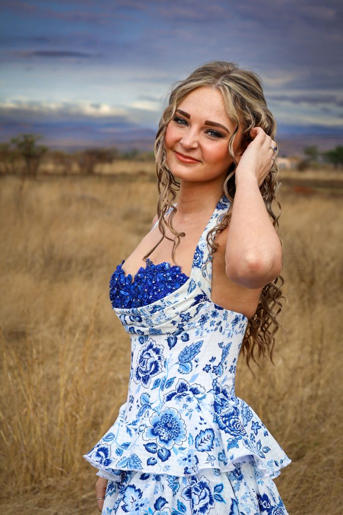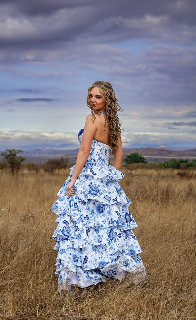 My inspirasie was om my vrolike en spontane persoonlikheid deur die blou blomme se elegante kontras teenoor die wit presies uit te beeld. Ek wou heeltemal ń unieke rok gehad het, wat almal se asem sou wegslaan. Die blou en wit herinner my ook aan absolute reinheid en skoonheid op ń ander vlak.