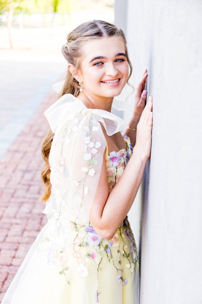 Die kleur van my rok was ʼn baie maklike keuse, want ligte geel is my gunsteling kleur en lyk altyd vrolik. Ek is mal oor enige iets wat blommetjies op het, daarom kon ek nie anders as om daarvan op my matriekafskeid rok te hê nie! Ek wou nie ʼn styfpassende of ongemaklike rok hê nie, want anders sou ek nie soos myself voel nie (en ek sou natuurlik nie so baie tyd op die dansbaan kon spandeer nie!) Laastens het die strikkies op my moue nog so bietjie detail bygesit en my rok perfek afgerond.