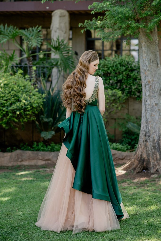 My 5-jarige ek was verlief op Tinkerbell en alles wat met feetjies te doen gehad het. Die fantasiewêreld het my nog altyd betower en ek wou graag 'n gevoel van nostalgie, wat vir 5-jarige Dalika sou trots maak, in my rok inkorporeer. Al wat ek vir Ernst gesê het is dat dit soos "pixie dust" moes lyk wat af drip. Ek het nog altyd geweet ek gaan 'n emerald kleur lap gebruik om my rooi hare te beklemtoon. Die vierkantige neklyn gee 'n gevoel van koninklikheid. Dit het my soos 'n prinses laat voel wat reguit uit een van my leesboeke uitgestap het.
