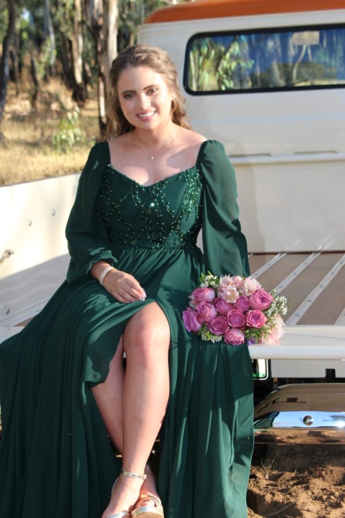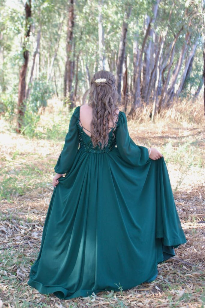 Ek het al van graad 5 af fotos bymekaar gemaak van n tipiese Belle-prinses rok, ń geel wye rok. Soos ek ouer geword het, het ek ń Emerald groen ontwikkel en my eie unieke styl gevind. Die inspirasie agter my rok se moue was dat ek bietjie anders wou wees en nogsteeds soos n prinses voel en lyk. Die idee was dat die rok se bostuk en die agterkant moes 'shine' en het die rok uniek gemaak.