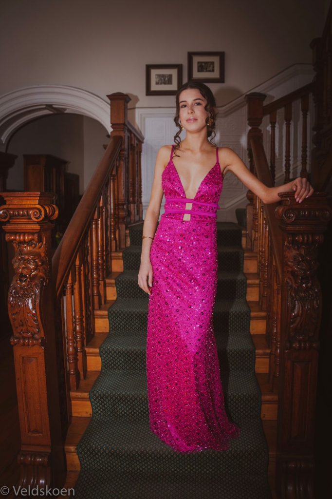 Ek hou daarvan om myself kreatief uit te daag, veral wanneer dit by my persoonlike styl kom. Daarom het ek besluit om my matriekafskeidrok in die kleur fuchsia te laat maak. Die kleur is ’n pragtige mengsel tussen donkerpienk en pers, en simboliseer selfvertroue en kreatiwiteit – twee eienskappe wat my persoonlikheid perfek weerspieël. Van die begin af het ek geweet ek wil ’n rok hê met ’n diep V-halslyn, omdat dit my figuur die beste komplementeer. Die fyn detail lê in die skeiding van die materiaal, wat met twee bande reg rondom my middel vasgebind is. Ek het ook ’n oop rug begeer, maar met ’n unieke, kreatiewe draai daaraan. Ek geniet dit om na skoonheidskompetisies te kyk, en dié wêreld het my beslis geïnspireer om meer waaghalsig en stylbewus te wees. Die elegansie van die rokke wat tydens hierdie kompetisies vertoon word, was my grootste inspirasie agter my eie matriekafskeidrok – ’n ontwerp wat vir my die perfekte balans tussen selfvertroue, styl en kreatiwiteit uitbeeld.