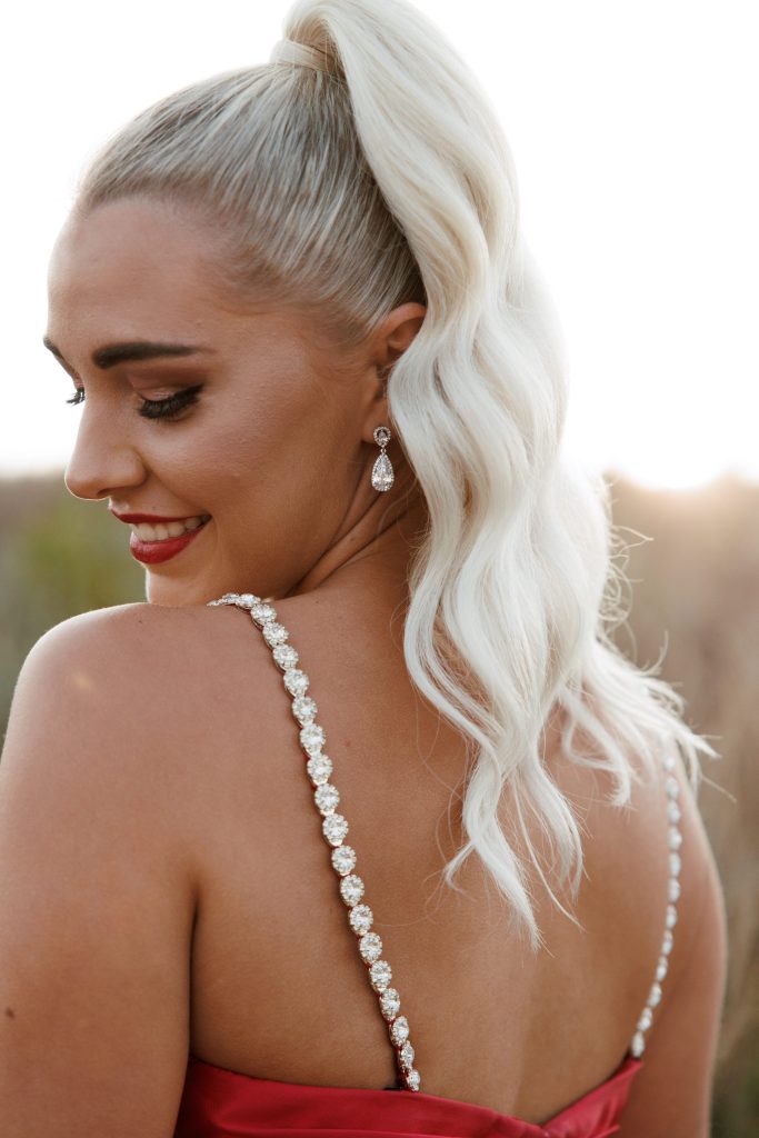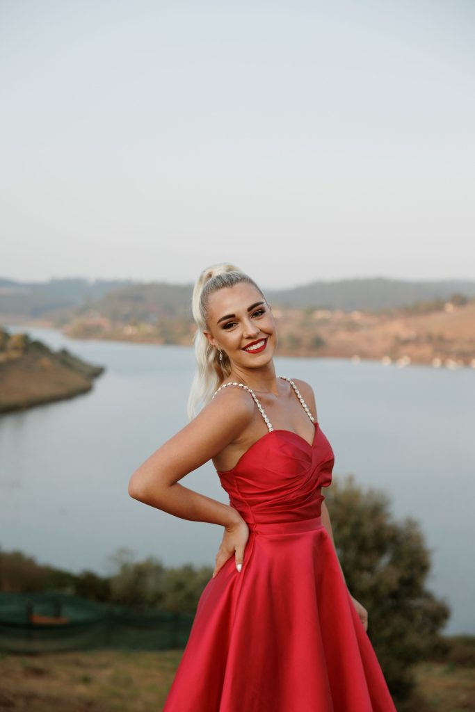 My rok is ’n pragtige, volronde balrok in ’n opvallende rooi kleur wat elegansie en selfvertroue uitstraal. Die materiaal het ’n sagte glans wat lig mooi vang, en die fyn bandjies met detail by die skouers gee dit ’n stylvolle en vroulike afwerking. Die eenvoudige maar luukse ontwerp beklemtoon my figuur perfek en pas uitstekend by die formele, tydlose atmosfeer van die matriekafskeid.