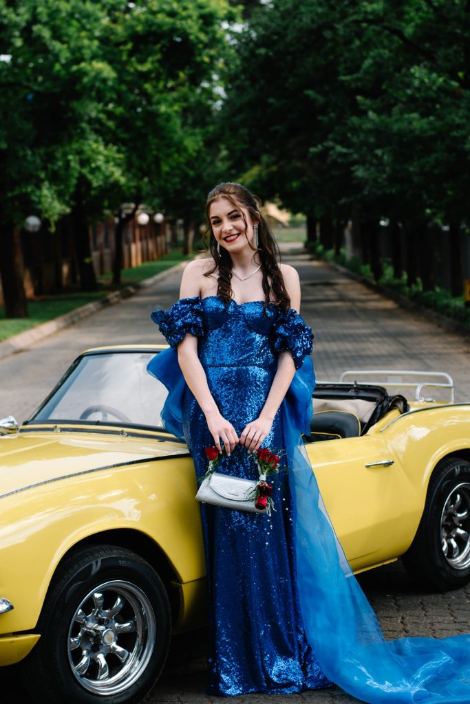My matriekafskeidrok is vir my ‘n simboliese viering van herinneringe, liefde en groei. Elke element van my rok vertel ’n storie: die blou kleur herinner my aan die helder water van Pringlebaai, waar ek as kind saam met my ouma en ouers sorgeloos gespeel het. Die rose op my rok is ’n spesiale eerbetoon aan my ouma, wat rose liefgehad het, en die kristalle wat tussenin glinster, simboliseer die sprankelende liggies op die see wat ek altyd met haar sal verbind. Vir my is hierdie rok dus nie net die hoogtepunt van my matriekjaar nie, maar ook ’n manier om my kinderjare, my familie en die mense wat my gevorm het, te eer. Dit is ’n herinnering aan waar ek vandaan kom - en aan die wind, die golwe en die liefde wat my altyd sal dra.