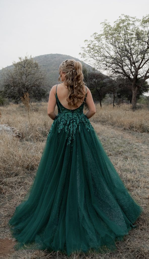 Die inspirasie agter my rok was 'n tydlose, sprokiesagtige gevoel. Ek wou iets hê wat elegant maar tog uniek is — iets wat natuurlik uitstaan sonder om oordadig te wees. Dit moet n gevoel van elegansie en rustiggeid skep, maar terselfdetyd n kragtige energie afgee van n nederige meisie wat n rok met baie selfvertroue dra. Groen is my gunsteling kleur. Groen is baie meer betekenisvol as net n kleur wat met die natuur geassosieer kan word. Dis vir my n teken van lewe in die natuur. Die feit dat daar lewe uitspruit na droogte, swaar reën en donderstorms. Die glinsterende detail wys op lig en lewe in die donker tye.