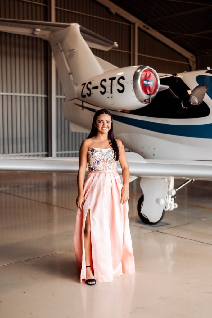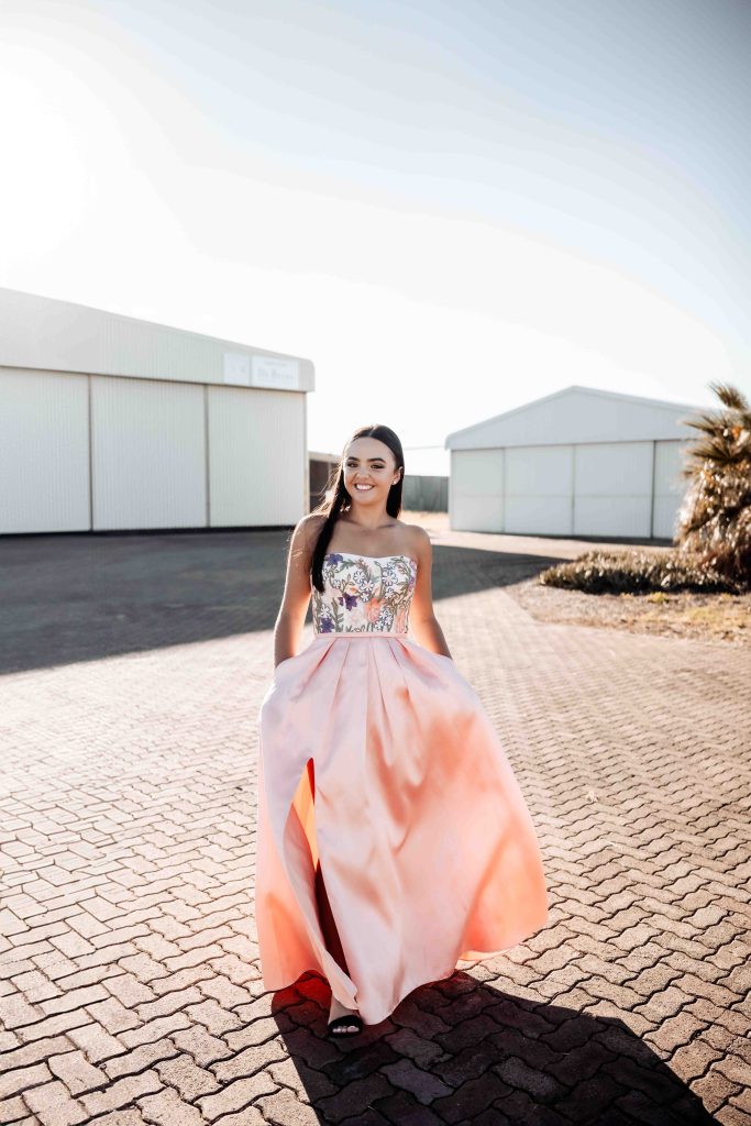 Ek het van rok winkel tot rok winkel gery in Pretoria en niks gevind na my smaak nie. Daarna het ek moed opgegee en dit oorweeg om my spesiale rok te laat maak. Ek het aande wakker gelê en gesoek na insperasie vir my blomme rok. Ons het een laaste Boutique probeer in George waar almal in my gesin vir rokke aangedra het en my ma se rok het gewen maar hulle sê mos “mother knows best”. Die lyfie van my rok is ’n stywe, gestruktureerde ontwerp met kleurvolle blommeborduurwerk wat vir my n elegante en romantiese gevoel gee. My romp was A-lyn silhoeët in n sagte perskepienk satynmatriaal.My snit sal ek beskryf as n moderne kinkel bygevoeg tot die klassieke styl. Algeheel het dit my elegant en vroulik laat voel.