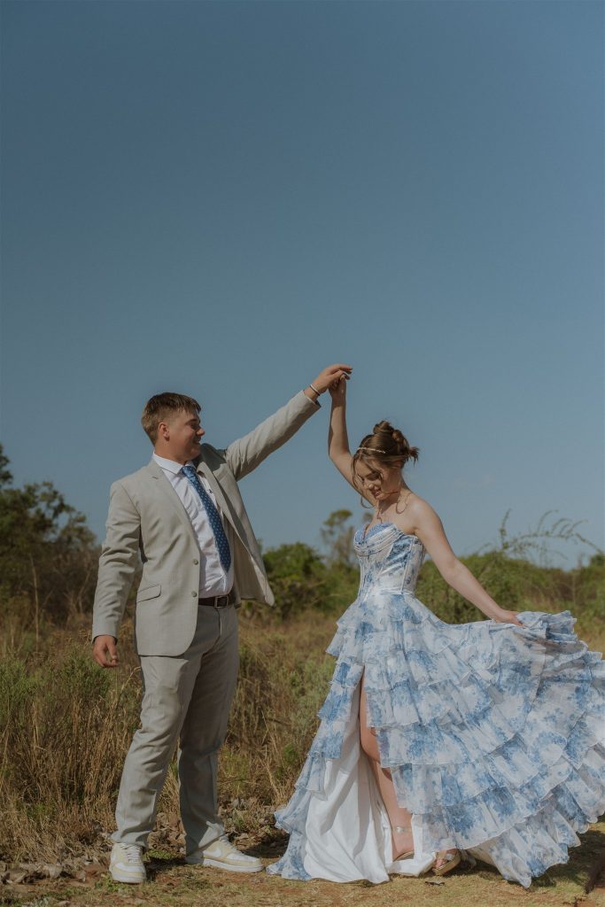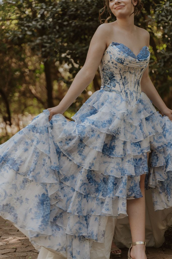 Ek het 'n strapless rok gekies wat n korset gedeelte het , met ń blou blomerige patroon bo-oor wit en 'n vol geruffelde romp. Dit het dadelik daardie "ek voel soos 'n prinses" gevoel gegee. Die patroon herinner my aan porselein en gee ’n uniek , elegant en dromerige gevoel.