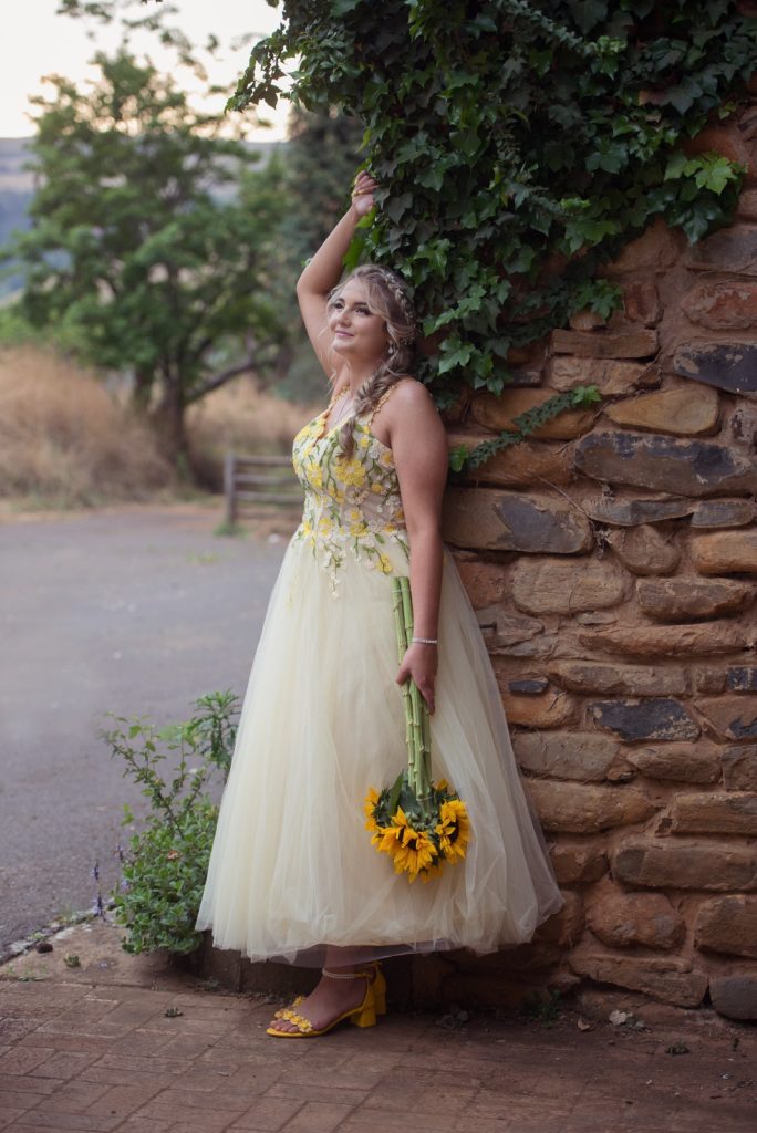 Ek het hierdie rok gekies vir my matriekafskeid omdat dit my persoonlikheid perfek weerspieël – sag, vrolik en vol lewe. Die geel en blomme simboliseer sonlig, groei en nuwe beginne, presies wat hierdie mylpaal vir my beteken. Ek wou iets dra wat my laat voel soos myself, maar steeds besonders en vol selfvertroue. My lewens motto is altyd wees soos n sonneblom en draai jou gesig na die son🌻💛