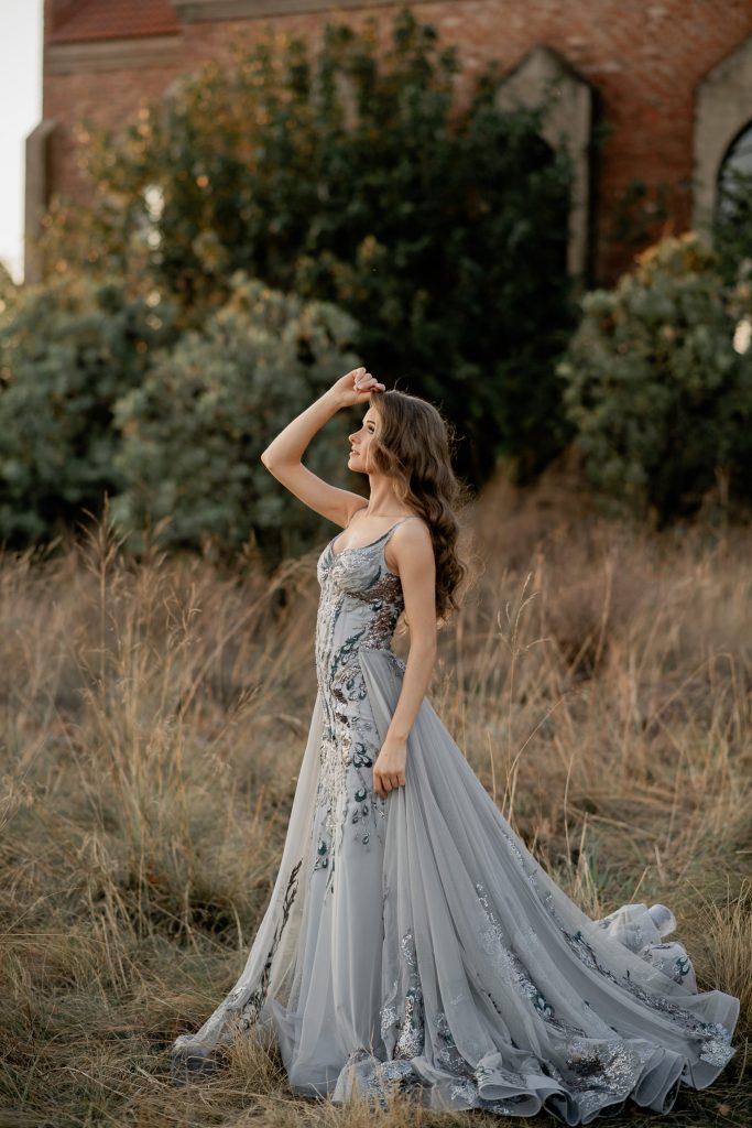 Ek het gestrewe na iets unieks. Ek was geïnspireerd deur 'n meer klassieke romantiese styl rok, en die grasie daarvan. Ek het die liggrys doelbewus gekies, nie bloot omdat dit ongewoon is nie, maar omdat dit vir my die sagte, elegante en beskeie beeld wat ek wou verteenwoordig, weerspiëel het. Hierdie kant was glansryk en uniek, met al die verskeidenheid interessante ontwerpe waarna ek gesoek het. Die monochrome van grys, verweef met ryk, donker turkoois en warm roesbruin, het saamgesmelt in 'n harmonie van kleur en het die klassieke romantiese styl waarna ek gestreef het, gekomplimenteer.