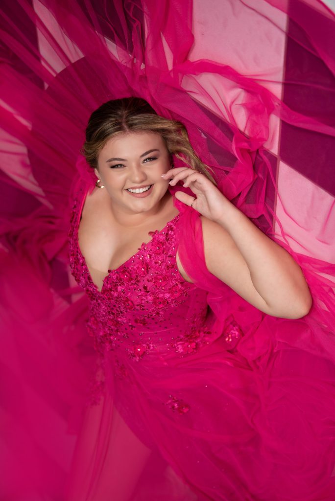 Die rok is ’n vrolike, kleurvolle speelse rok met sy helder pienk kleur wat warmte en geluk uitstraal. Die fyn blommietjies en krale op die bolyf laat die rok sprokiesagtig voel, terwyl die sagte strikkies by die moue dit dromerig en speels maak. Die verskillende lae van die romp gee die rok beweging en as jy dans koekeloer die glittermateriaal uit en gee 'n glinsterende dimensie aan die rok.