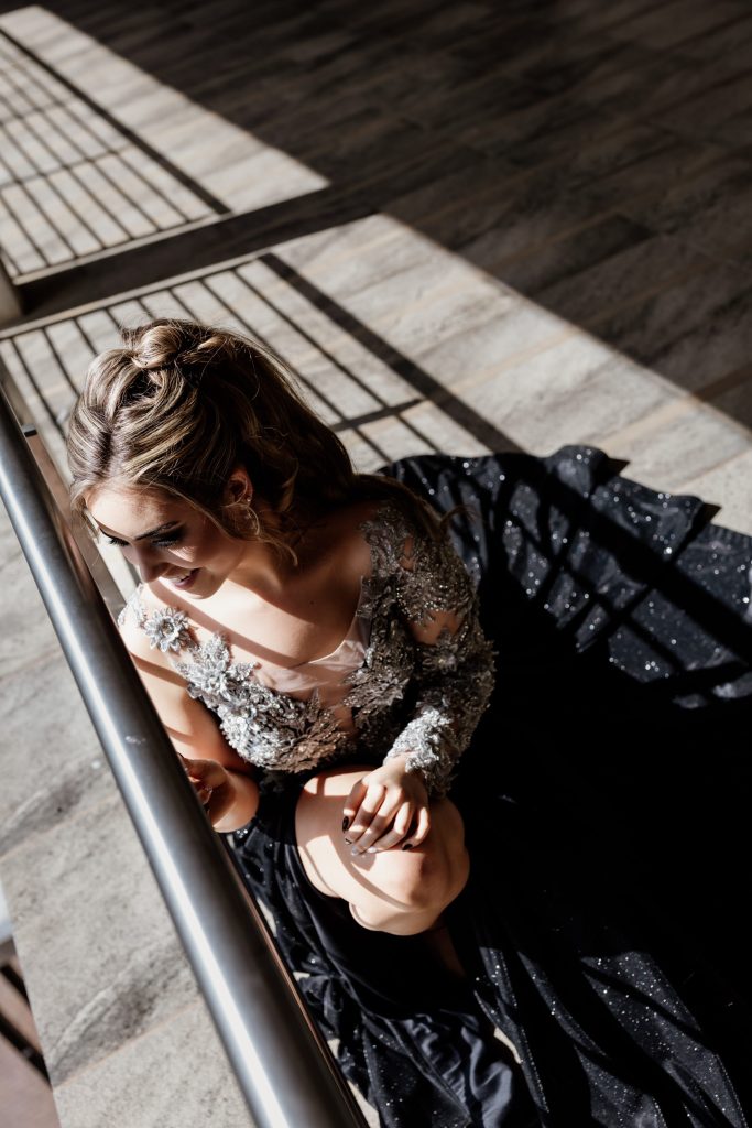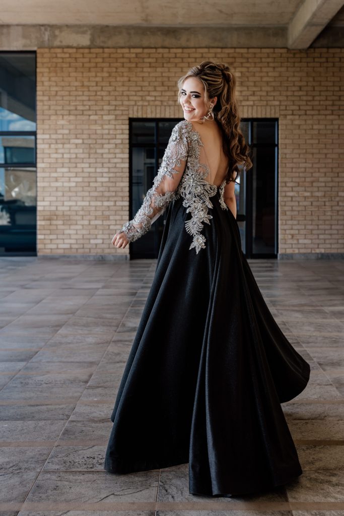 Ek wou n stylvolle rok gehad het wat steeds modern en elegant is, wat anders is maar steeds klassiek bly, iets wat my persoonlikheid weerspieël: selfversekerd maar nie oordadig nie. Die swart materiaal is gekies omdat dit tydloos en gesofistikeerd lyk, terwyl die silwer kantdetail n bietjie glans en vroulikheid byvoeg sonder om oordadig te wees.