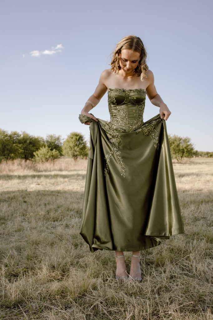 Ek het nog altyd geweet ek wil 'n groen matriekafskeid rok hê. Ek is baie lief vir die natuur so dit is eintlik vanselfsprekend dat groen my gunsteling kleur is. Ek het op die internet inspirasie gaan soek toe ek afkom op 'n rok met 'n "dropwaist" ontwerp. Ek was dadelik verlief. Dit was die sleutel element van my rok en alles is om dit ontwerp. Ek is 'n groot "go with the flow" mens so ek het vir my ma gesê sy kan groot gaan en haar kreatiwiteit uitleef. Sy het self al die patrone en kraletjies opgewerk soos sy goed gedink het.