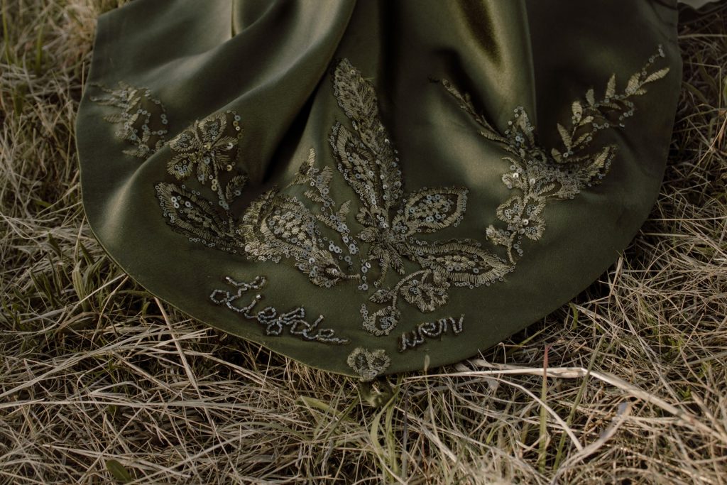 Onder op my rok se sleep het my ma die woorde "liefde wen" met kraletjies gewerk. Dit is 'n lewens motto waarvolgens ek elke dag probeer lewe. Ek glo dat ons die wêreld kan verander as ons almal om ons lief het, ongeag ons verskille. My rok is ook 'n uitbeelding van hoe ek oor die natuur voel. Dit skep 'n prentjie van hoe ek saam met die ekologie in eenheid lewe, en hoe ná aan my hart dit is.
