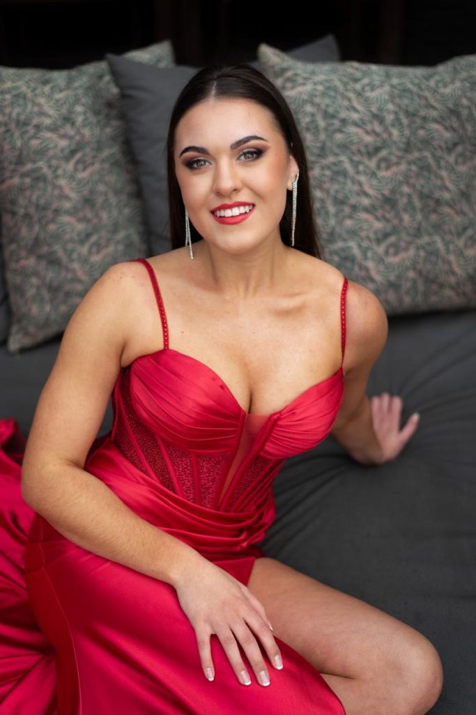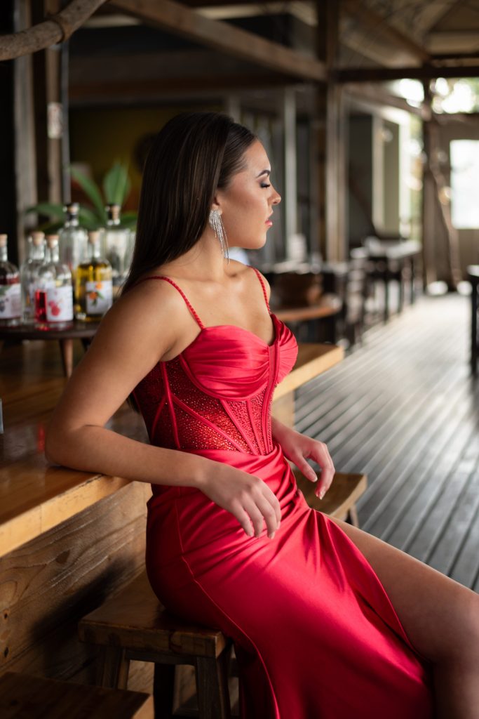 Die rok is ń opvallende, glansende rooi satyn rok wat onmiddellik my aandag getrek het. Dit het dun spaghettibandjies en ń korset met fyn deurskyndende panele vol sequence en vertikale nate wat my middellyf beklemtoon. Die romp val regaf in ń diep helper rooi wat passievol en glamarous lyk. Altesaam skep die rok ń stylvolle, jong maar steeds elegante voorkoms.