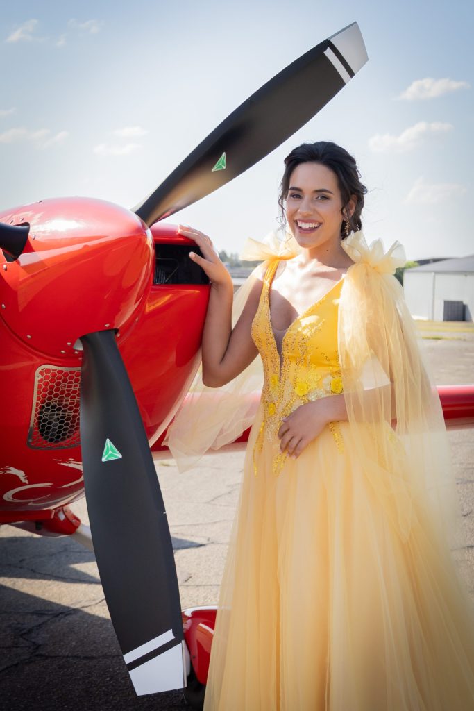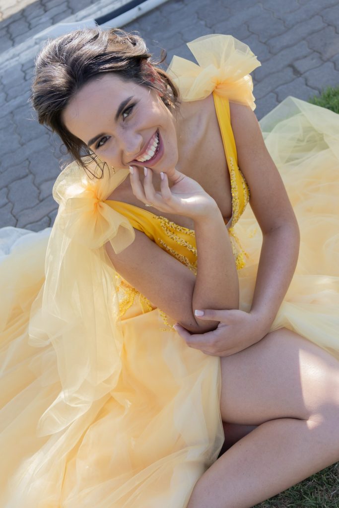 Ek het besluit op geel want ek is in almal se oë ‘n sonneblom wat altyd na die lig toe draai. Geel is nie net ook my gunstelling kleur nie, dis ook ‘n pragtige refleksie wat positiewe energie & emosies van gelukkigheid, optimisme, hoop en helderheid uitbeeld. Ek het spesifiek die fyn blomme detail op my rok gekies want my leuse in die lewe is blom waar jy geplant is. Die baie lae materiaal is om die verskillende lae van my persoonlikheid en gawes uit te beeld.