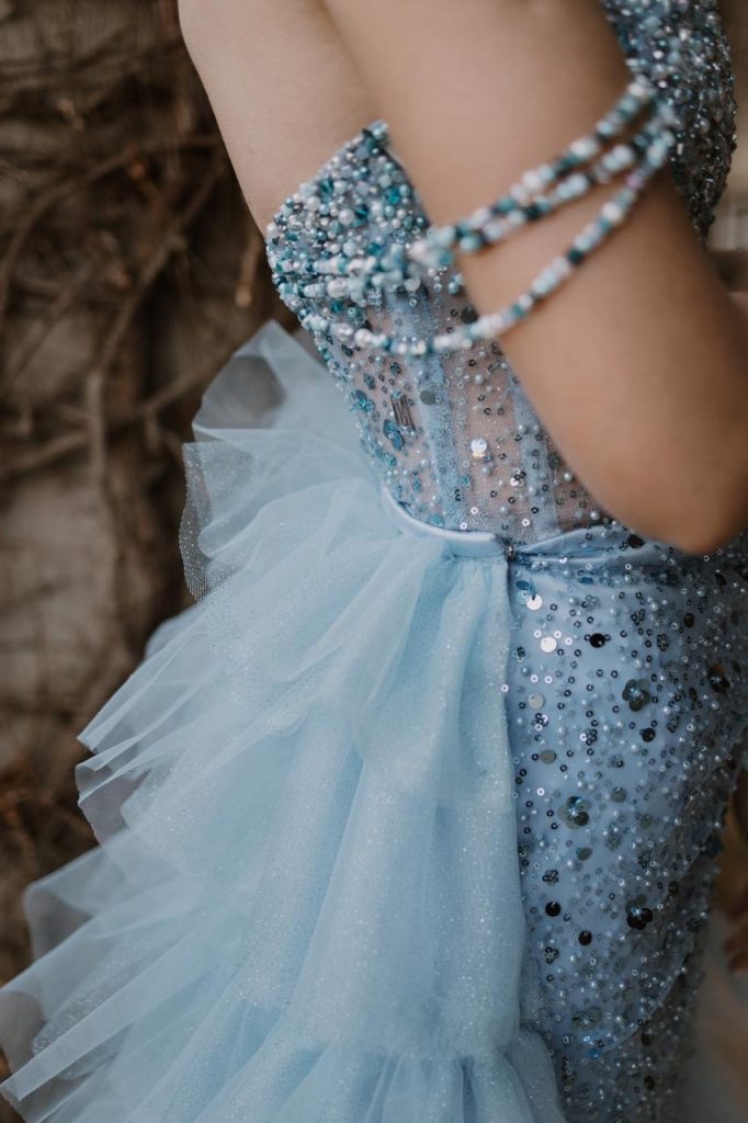 Ek wou graag ń noupassende rok hê wat stylvol en modern lyk maar nogsteeds ń bietjie sprokie-effek gee. Ek kon nie besluit op ‘n tipe blou kleur nie en was toe baie bly toe die krale verskeie kleur blou weerspieël het.