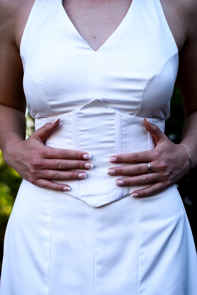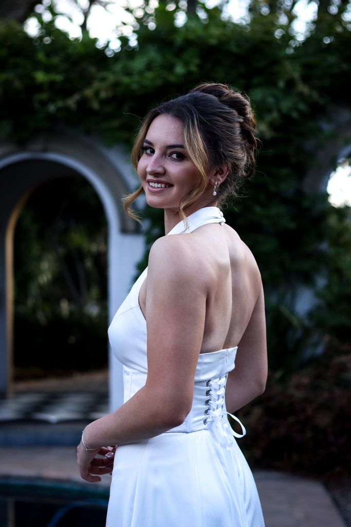 Ek wou 'n ontwerper rok in 'n onverwagse kleur, wit hê. Ek het die rok ontwerp, die eenvoudige halternek, met die korset as fokuspunt.