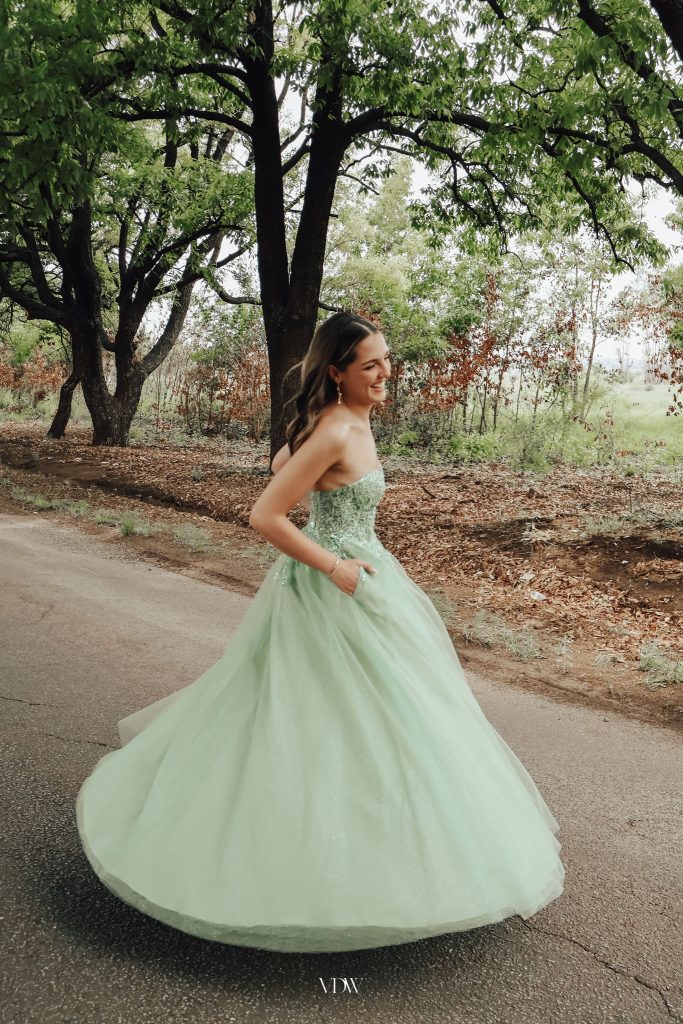 Ek wou iets dra wat my soos die prinses wat ek nog altyd wou wees laat voel. Die meisie wat met groot drome en ’n sagte hart grootgeword het. My inspirasie het gekom van die idee om weer soos my jonger self te voel – sorgvry, dromerig en vol verwondering. Ek wou ’n rok hê wat daardie sprokiesgevoel vasvang, maar steeds elegant en vol selfvertroue lyk. Die sagte groen kleur herinner my aan natuur en groei, iets wat perfek simboliseer hoe ek gegroei het deur my skooljare en nou gereed is om my volgende hoofstuk te begin.