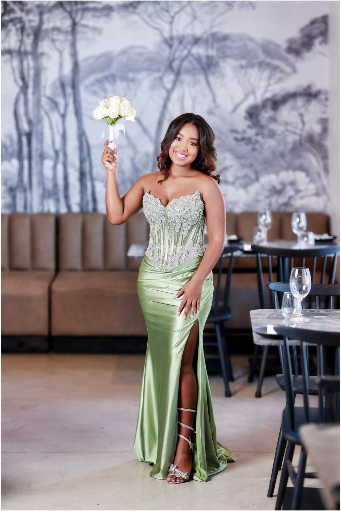 Ek wou iets hê wat sag en elegant voel, maar steeds ’n bietjie van my persoonlikheid wys. Die liggroen kleur herinner my aan nuwe beginne ,vars energie en dit voel natuurlik, vroulik en vol lewe. Die korset met sy fyn detail bring ‘n bietjie van daardie klassieke, tydlose styl in, terwyl die glans van die satyn en die hoë spleet ‘n moderne en selfversekerde rand gee. Ek wou hê my rok moes my laat voel soos die beste weergawe van myself sterk, mooi en vol selfvertroue.