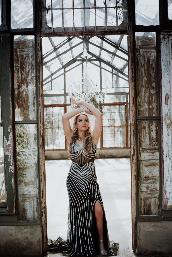 My inspirasie vir die rok was om ’n balans te skep tussen elegansie en moderne glamour. Ek wou hê die rok moes my styl en selfvertroue uitbeeld, met die silwer strepe en glinsterende afwerking wat ’n tikkie luuksheid byvoeg. Die skeur en fyn besonderhede is geïnspireer deur kontemporêre rooi tapyt-ontwerpe, wat die rok laat uitstaan sonder om oordadig te wees. Dit verteenwoordig vir my ’n gevoel van krag, styl en tydlose skoonheid.