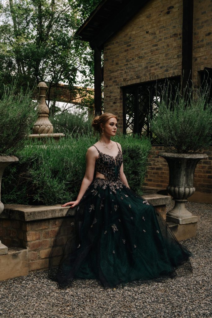 Vir my Matriekafskeidrok het ek my liefde vir groen, goud en blomme gekombineer om koninklikheid uit te straal. Ek was wel bewus van die feit dat groen en goud óf uitstekend óf soos ń modekrisis kan lyk. Alhoewel die blomme die aandag steel, maak die glinsterende romp ook ń verskyning om nie weg te raak in die aand nie, maar dis ook nie oorweldigend nie.