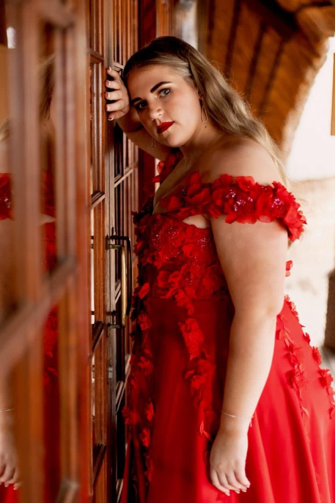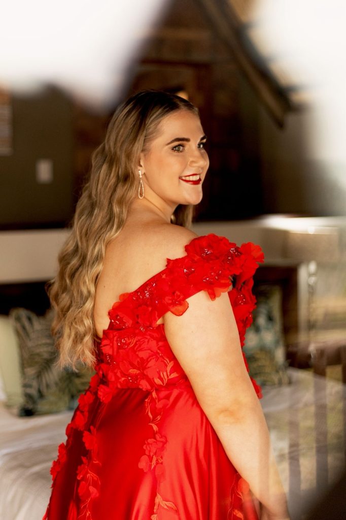 My gunsteling deel van my matriekafskeidrok was beslis die bo-stuk met die blomdetail. Die handgemaakte blomme en sagte tekstuur het iets besonders en romanties aan die rok gegee. Dit het vir my gevoel asof ek iets dra wat met sorg en liefde gemaak is. Ek het gehou van hoe die blomme oor my skouers val en die rok ’n unieke, vroulike aanraking gee. Dit het perfek gekombineer met die helder rooi kleur en my laat voel asof ek in die kollig is – stylvol, selfversekerd en heeltemal in my eie element.