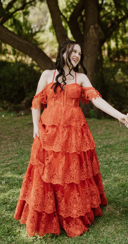 My rok is spesiaal omdat dit met die hand gemaak is, net vir my, deur Jacqueline’s Bridal Studio. Die unieke rooi valletjies en fyn kant laat my soos ’n regte prinses voel.