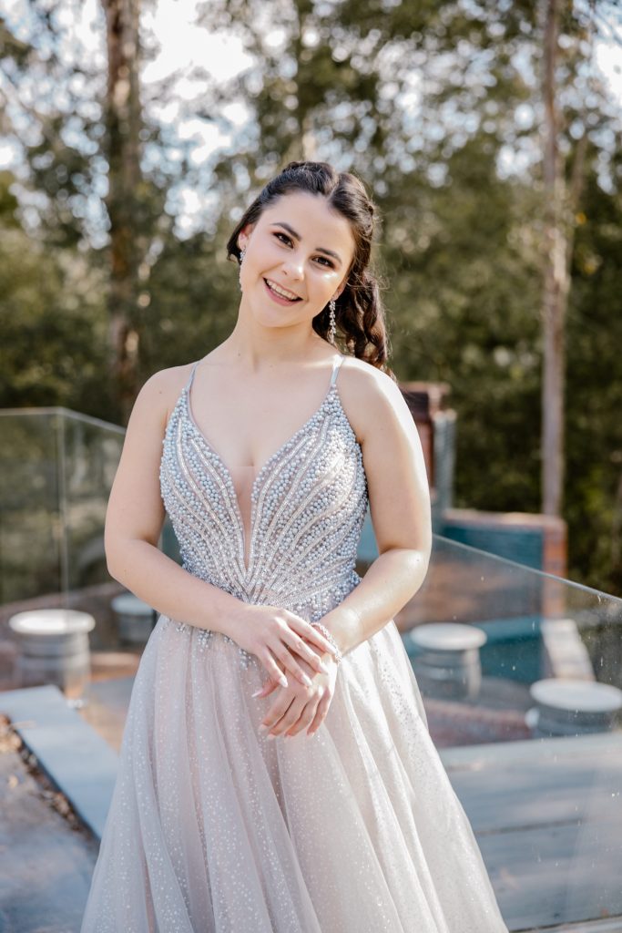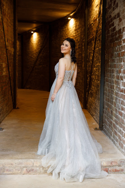 My rok is ’n silwerkleurige balrok met sagte lae materiaal wat elegant oor die vloer vloei. Ek het verlief geraak op die rok die oomblik toe ek dit by Livia and Co in George aangepas het. Die ontwerp is sprankelend en verfynd, met fyn krale en pêrels wat in die lig glinster en ’n dromerige, prinsesagtige gevoel gee. Die diep V-neklyn met dun bandjies bring ’n moderne aanraking, terwyl die vol romp die klassieke balrokstyl behou. Ek wou iets hê wat tydloos en betowerend lyk — iets wat lig vang en beweeg saam met elke tree. Die sagte ligte en warm baksteenmure van die lokaal het perfek saamgespeel met die silwer glans van my rok, wat my laat voel het asof ek in ’n toneel uit ’n sprokiesfilm stap. Hierdie rok laat my soos myself voel, net in my mooiste vorm. Elke detail — van die sagte vloei van die stof tot die perfekte pasvorm — laat my onthou hoe spesiaal daardie aand was. Dit is nie net ’n rok nie; dit is ’n simbool van ’n droom wat waar geword het.