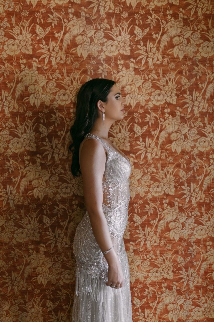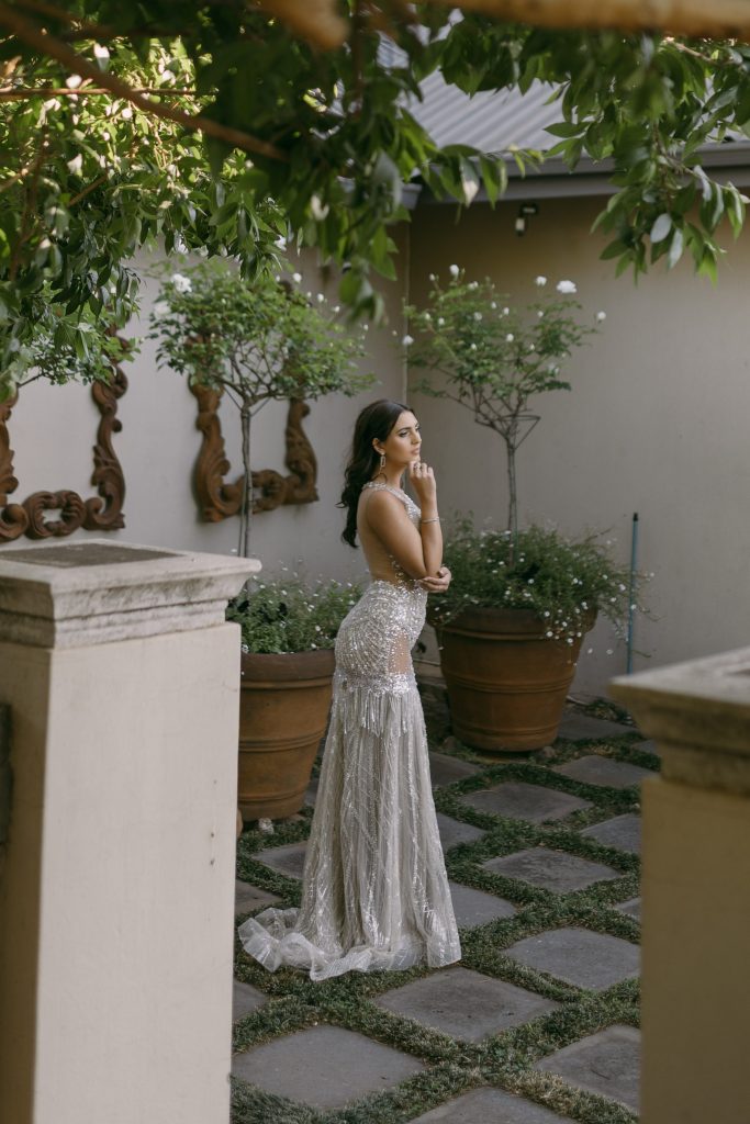 Silwerskerm-glans: Die kralewerk, moulose rok met 'n gepaste silhoeët skree ou Hollywood of 'n glansryke toekenningsgeleentheid-atmosfeer. Die rok se skoon lyne en vonkelende besonderhede sorg vir 'n pragtige, opvallende voorkoms.