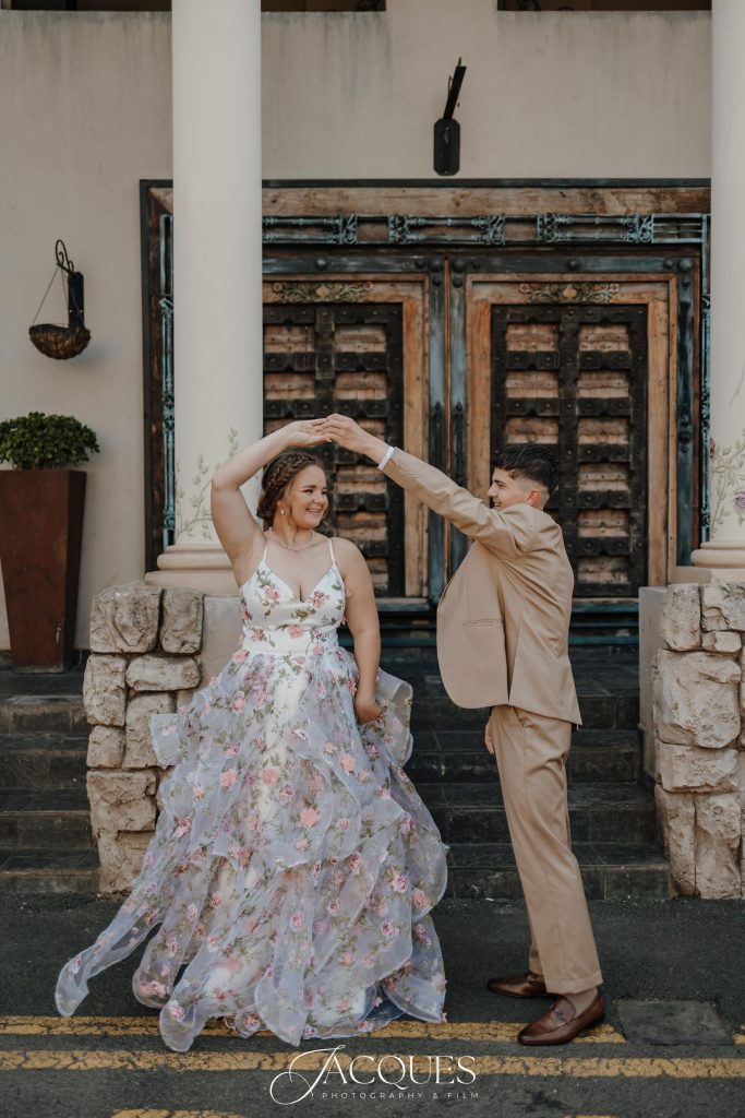 My rok is ontwerp en gemaak deur Wedding Bells in Witbank. Dit is gemaak van unieke materiale met 'n 3D-effek met die blomme wat uitstaan. Daar is los materiaal om die middellyf gewerk wat dit die prinses-voorkoms gee sonder om 'n hoepel te dra. My rok het ook dun bandjies met 'n toeryg rug.