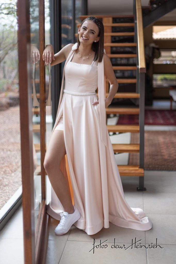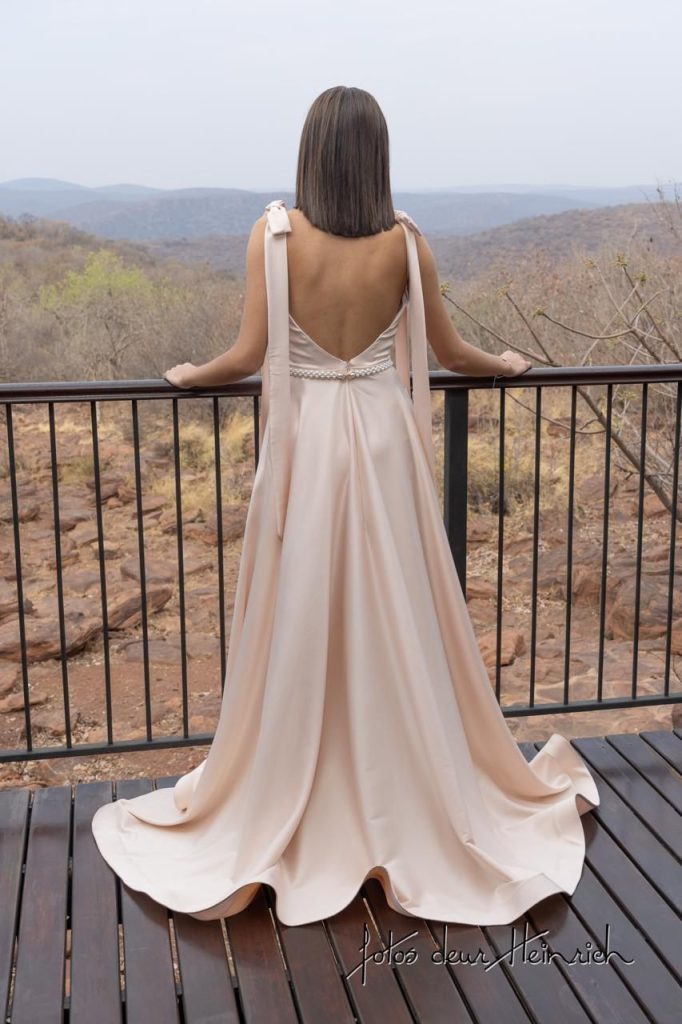My rok is ’n wye, elegante skepping van pêrelpienk satyn. Die materiaal vou soepel oor my liggaam, en elke beweging laat die satyn skitter met ’n sagte glans. Aan die skouers is daar fyn, delikate strikkies wat eenvoud van die ontwerp beklemtoon. Die oop rug skep ’n stylvolle afwerking wat onmmidelik al die aandag daarop vestig. Aan die voorkant gee ’n hoë oorvou slit net die regte hoeveelheid selfvertroue – dit wys genoeg been om die aand se ligte vas te vang wanneer jy loop, sonder om die elegansie te verbreek. Die sleep vloei met gemak agter jou aan. Elke tree is lig en gemaklik – jy kan dans, lag en asemhaal sonder om vasgevang te voel.