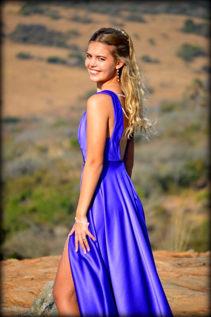Ek het my rok self ontwerp en gemaak. Die rok het ‘n V-snit voor en agter. Die top gedeelte is in pante gedeel wat ‘n korset effek het maar het nie “boning” ingesluit nie. Agter word die moue gebind deur twee stringe pêrels. Die V-snit agter gaan laag af tot waar die romp in die middellyf ontmoet. Die romp gedeelte is ‘n vol sirkel snit wat in twee gedeel is en agter bymekaar kom, daar is ook ‘n “slit” voor aan die linkerkant. Onderaan die romp is daar “Crinoline” aangewerk om die rok mooi af te werk. My rok is pers met ‘n blou ondertoon.