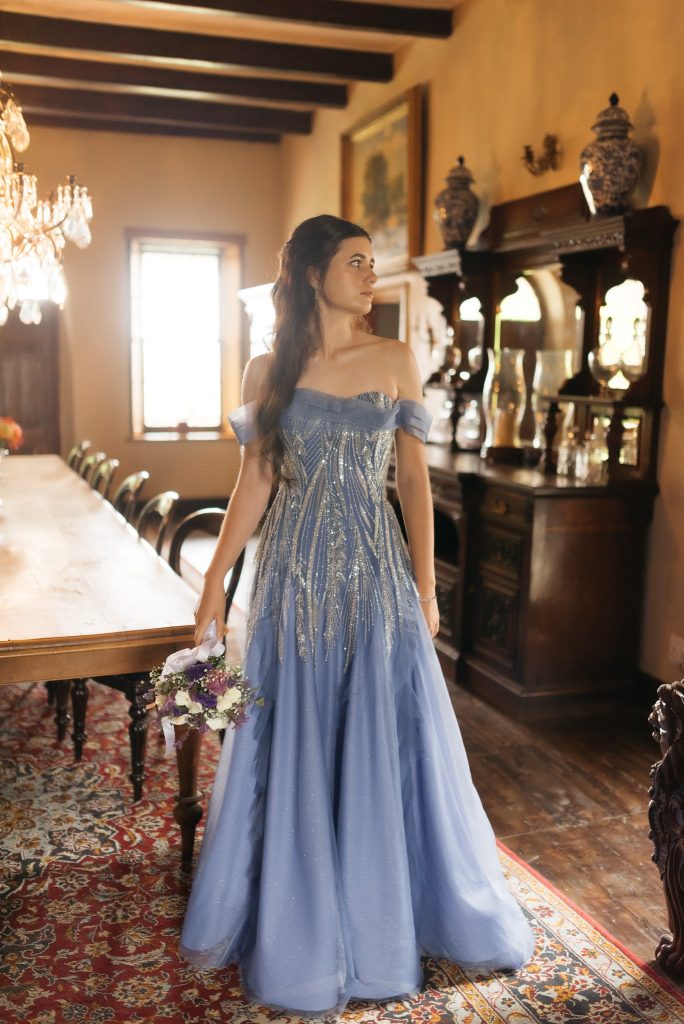Die inspirasie agter my matriekafskeidrok was die naghemel, daardie oomblik net na sonsondergang wanneer die wêreld stil raak en die eerste sterre begin skyn. Ek wou hê my rok moes daardie gevoel vasvang: dromerig, kalm, maar tog vol lig en lewe. Die sagte periwinkle-blou kleur herinner my aan skemer, terwyl die silwer kralewerk soos vallende sterre oor die lap versprei. Ek was verlief op hoe die glinsterende patrone sag afwaarts vloei, amper soos ligstrale wat oor water skyn. Die afskouer-ontwerp het vir my ’n sagte, romantiese gevoel gegee en die lae van tule laat die rok vloei soos dit beweeg. Vir my simboliseer die rok lig in donkerte; om altyd mooi en sterk te bly, selfs in moeilike tye. Ek wou iets dra wat nie net mooi lyk nie, maar ook ’n storie vertel; een van drome, hoop en innerlike lig.