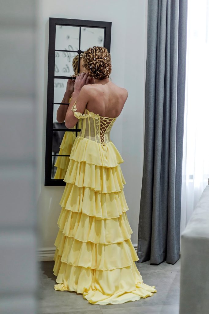 My rok simboliseer ‘n mylpaal in my lewe. Geel word verbind met sonlig, energie en geluk. Elkeen van ons is uuniek geskape en elkeen dra haar eie skoonheid met haar saam. Lizan Zondagh het ‘n besonderse talent. Ek is mal oor die simplisitseit maar elegansie van my rok. Die nommerpas korset bo-stuk met die fyn kant wat sagkens hang oor my arms is my gunsteling.