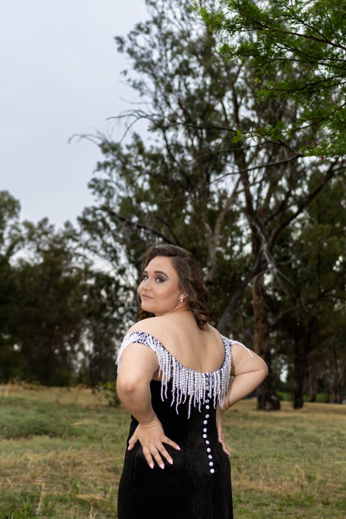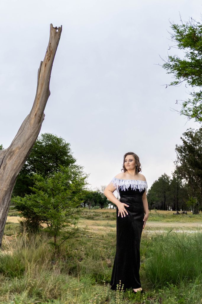 Hierdie rok is meer as net ’n kledingstuk, dit is ’n verlengstuk van wie ek is en van die mense wat my gevorm het. Die pêrels herinner my aan my ouma en laat my voel asof sy stilweg saam met my vier. Swart Duitse fluweel omvou my met ’n gevoel van krag en selfvertroue, en laat my beweeg met waardigheid en kalmte. Wanneer ek die rok dra, voel ek nie net mooi nie, ek voel heel, sterk en seker van myself. Dit herinner my dat styl nie gaan oor om die mees opvallende te wees nie, maar oor om met teenwoordigheid, selfvertroue en subtiliteit te praat. Hierdie rok is vir my ’n simbool van balans: sag en sterk, elegant en betekenisvol, en dit dra die liefde, inspirasie en herinneringe van die mense vir wie ek lief is wat by my elke stap was.
