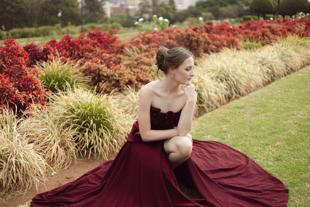 Die inspirasie agter my matriekafskeidrok was ’n kombinasie van tydlose elegansie en vroulike selfvertroue. Ek wou iets hê wat sag en romanties voel, maar steeds kragtig en uniek is. Die diep wynrooi kleur simboliseer vir my passie en volwassenheid, terwyl die blomdetail ’n sagte, dromerige element byvoeg wat die rok lewendig maak. Ek wou hê my rok moes wys hoe ver ek gekom het – van ’n skoolmeisie na iemand wat gereed is vir ’n nuwe hoofstuk. Dis ’n ontwerp wat vir my sê: stylvol, sterk en trots op wie ek is.