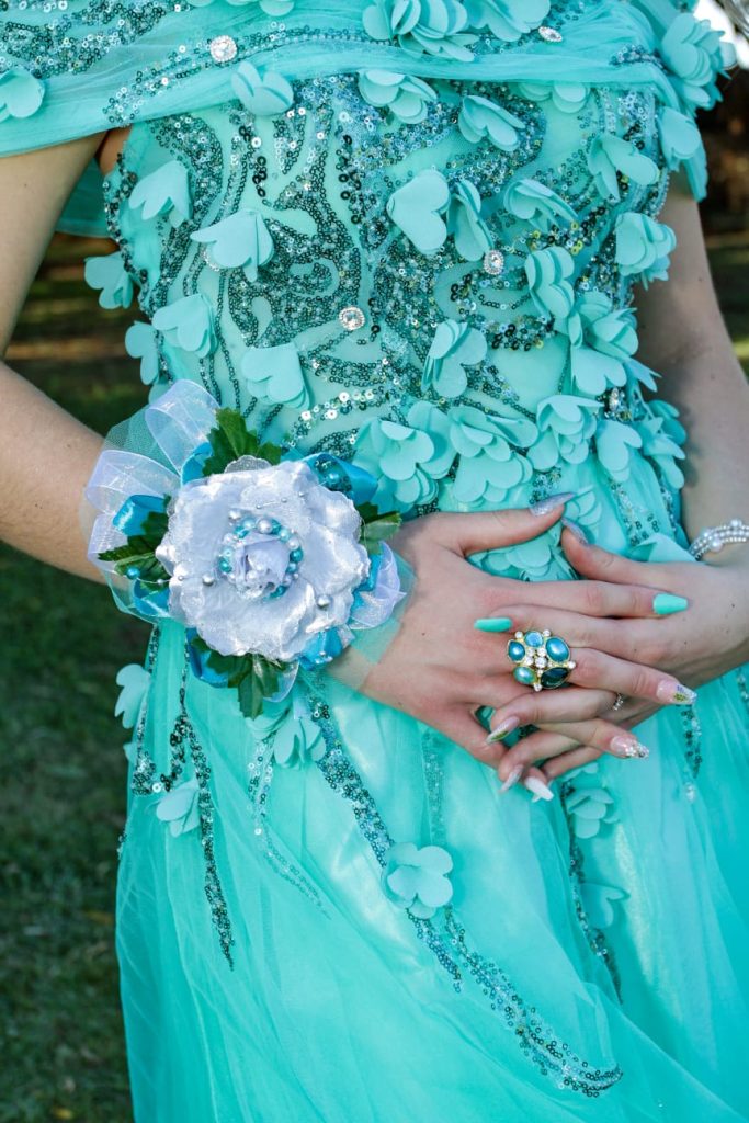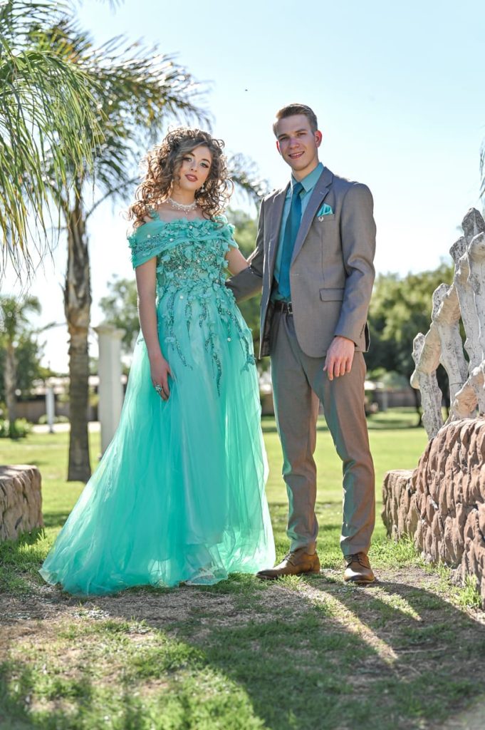 Ek het my matriekafskeidrok aanlyn gekoop, maar ek en my ma het ons persoonlike kunstenaarskap aan die rok toegedien. My rok se onderlaag is uit satyn, met twee lae net wat oormekaar is. Die boonste gedeelte van my rok is vir my asemrowend; ñ korset wat uit sagte materiaal bestaan, met ñ boomkroon-patroon wat uit "sequence" is. Die boomkroon-patroon word oor die hele rok uitversprei. Daar is ook blommetjies oral op die patroon geplaas. Daar is ook ñ kant gedeelte oor my skouers waarop hierdie kunswerk ook verskyn. My mamma het vir my ekstra diamant knopies op my rok opgewerk om dit net daai ekstra glinster te gee. My ma het ook gehekelde kant skouerbandjies met pêrels op vir my aangewerk; sy het ook my rok verkort voor, sodat ek my besonderse mooi pêrel skoene kan wys.
