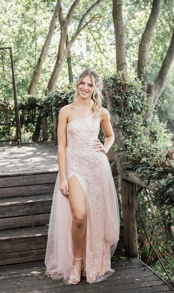 Dus my rok, ligpienk met fyn diamantvertakkings en ’n onsimmetriese skouer en elegante ‘tulle’ wat my rok uniek maak.