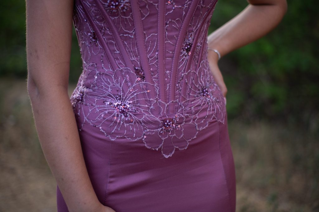 Hierdie rok is ’n pragtige weerspieëling van wie ek is — sag, maar sterk; elegant, maar eg. Die diep pers kleur simboliseer lojaliteit, empatie en opregte omgee — eienskappe wat ek koester en in alles probeer uitleef. Die delikate kantblomme op die bo-stuk bring ’n gevoel van vroulikheid en sagte krag, amper soos herinneringe aan groei en bloei deur die jare. Elke detail van die rok vertel iets van my persoonlikheid: stylvol, selfversekerd en spontaan.