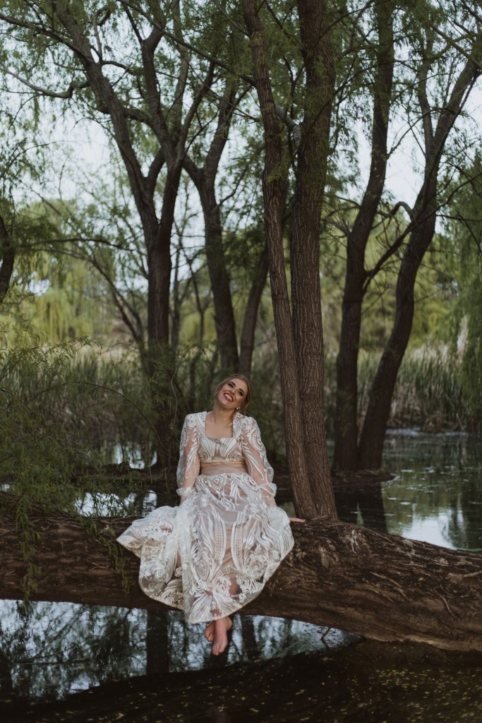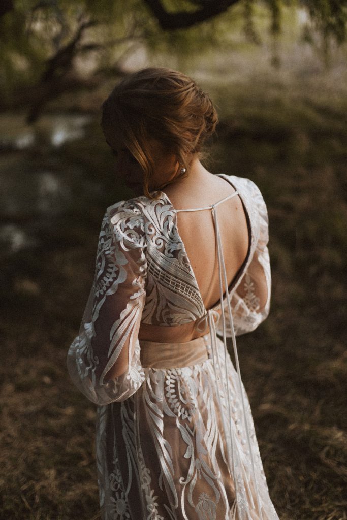 Vir my, beteken my rokkie baie (om die minste te sê) maar vir baba Zé beteken hierdie rok soveel meer. Vir haar, beteken hierdie rok drome van ń leeftyd. Haar leeftyd. Haar lewe. Die patrone op die kant simboliseer haar – haar geloof, haar menswees en al haar wildste drome. Die lang moue dra ń leeftyd se emosies, ń leeftyd se hartklop, dit dra oomblikke van broosheid en oomblikke van geluk – alles gebind aan haar sagte hartjie. Die oop magie, is ń herinnering aan die tyd toe sy met baie selfvertroue, haar boeppensie kon ‘af show’, sonder skaamte. Die afloop en sleep van die rok is ń simbool van ń leeftyd vol herinneringe, groei, lesse en hoe dit haar gevorm het in die persoon wie sy vandag is. Baba Zé, hierdie rok beteken vir my baie – ek hoop ek kon jou verwagtinge en drome oortref met elke stukkie beplanning wat in hierdie rok van jou in gegaan het.