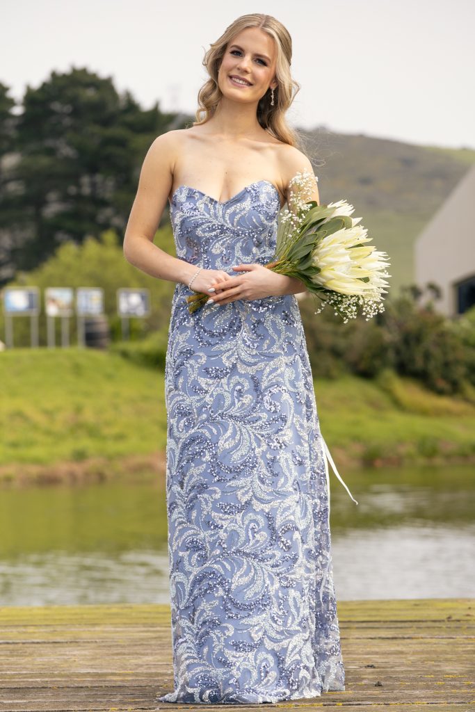 My rok is geïnspireer deur die kalmte en die skoonheid van water, iets waarmee ek nog altyd ’n sterk verbintenis het. Blou is my gunstelingkleur, nie net omdat dit mooi is nie, maar omdat dit vir my vrede, diepte en selfvertroue simboliseer. Die sprankelende kraletijies laat my dink aan hoe lig oor water dans, en vang daardie gevoel van grasie en innerlike krag vas. Ek wou ’n rok hê wat tydloos en elegant is, maar steeds ek eg: sag, vol selfvertroue, en met ’n bietjie sprankel.