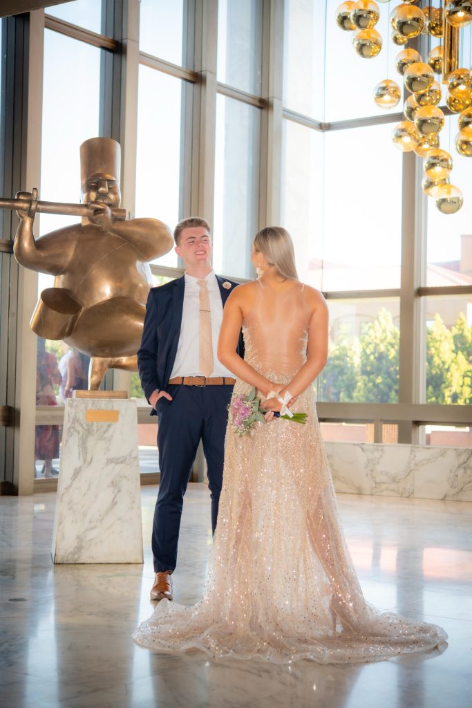 My voorkoms en elke detail vir my matriekafskeid is deurdag en verfyn. My hare is netjies in n elegante styl, wat my gesig mooi raam en my oorbelle beklemtoon. Die oorbelle is opvallend, wat perfek aansluit by die glans van die rok. Die gremeering is sag, tog glansend, n kombinasie van natuurlike kleure met n tikkie goud, om my oë te laat uitstaan. Die skoene is delikaat en eenvoudig, maar vol klas. Selfs die motor en die Sand du Plessis teater waar die foto's geneem is, het bygedra tot die volmaakte prentjie.